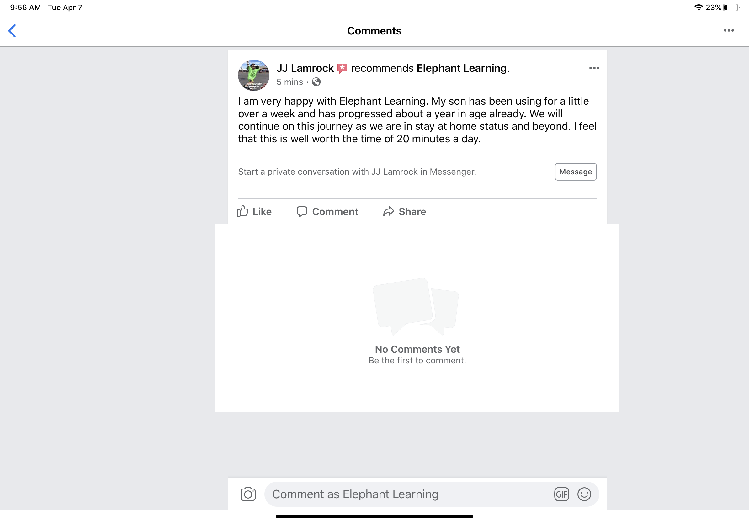 ...I am very happy with Elephant Learning...